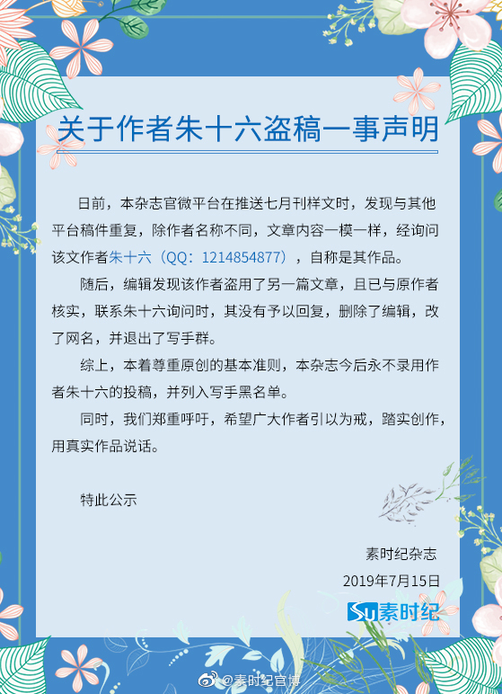 全文如下: 《关于作者朱十六盗稿一事声明》 日前,我司《素时纪》杂志官方微信平台在推送七月刊样文时,发现某稿件 […]